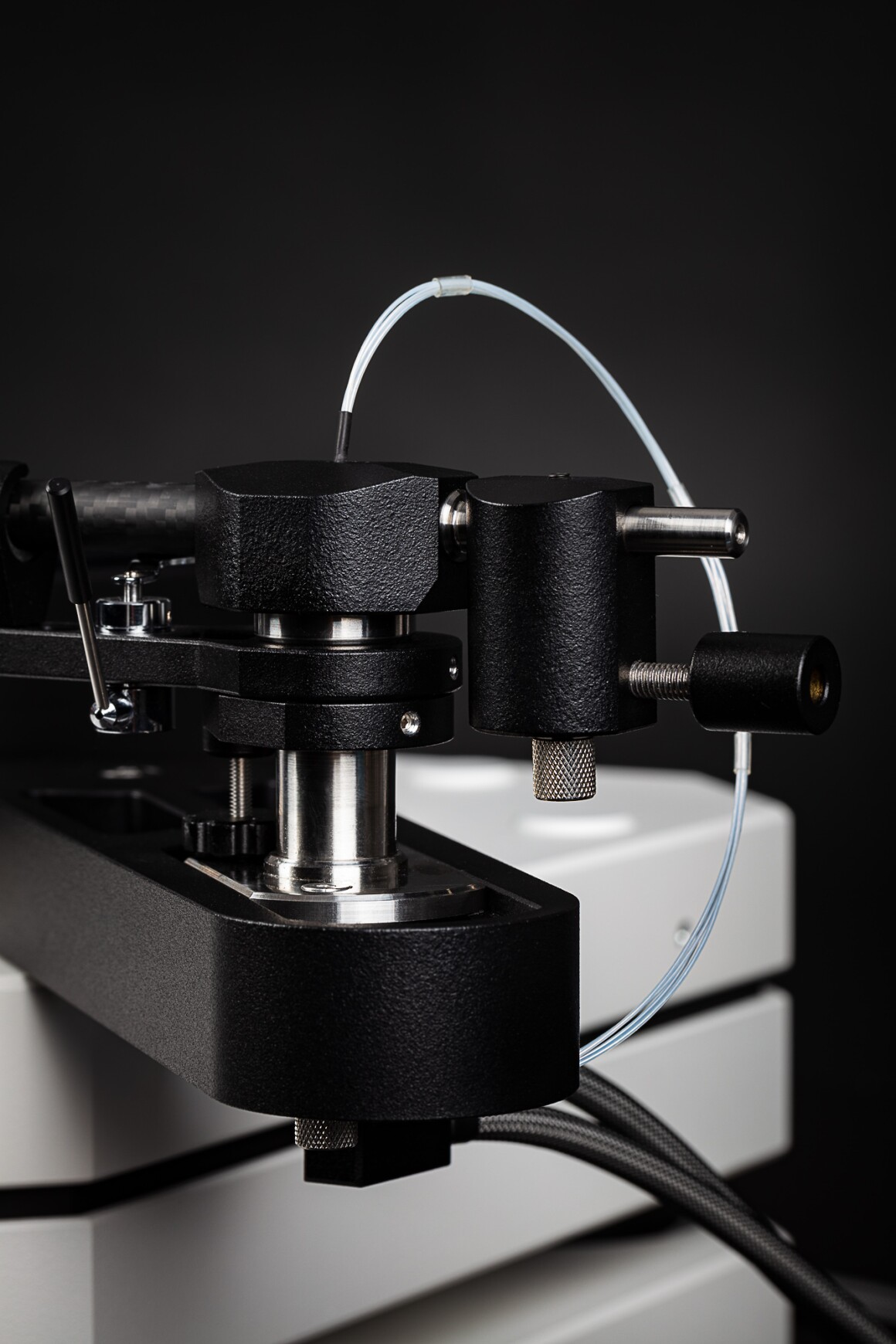В основе конструкции лежит система из трех пластин (Delrin и нержавеющая сталь) общей массой 17 кг, обеспечивающая исключительную стабильность вращения. Изготовленный на заказ подшипник с масляной смазкой оснащен валом диаметром 15 мм, шариком из спеченного карбида и втулкой из алюминия и материала PEEK.